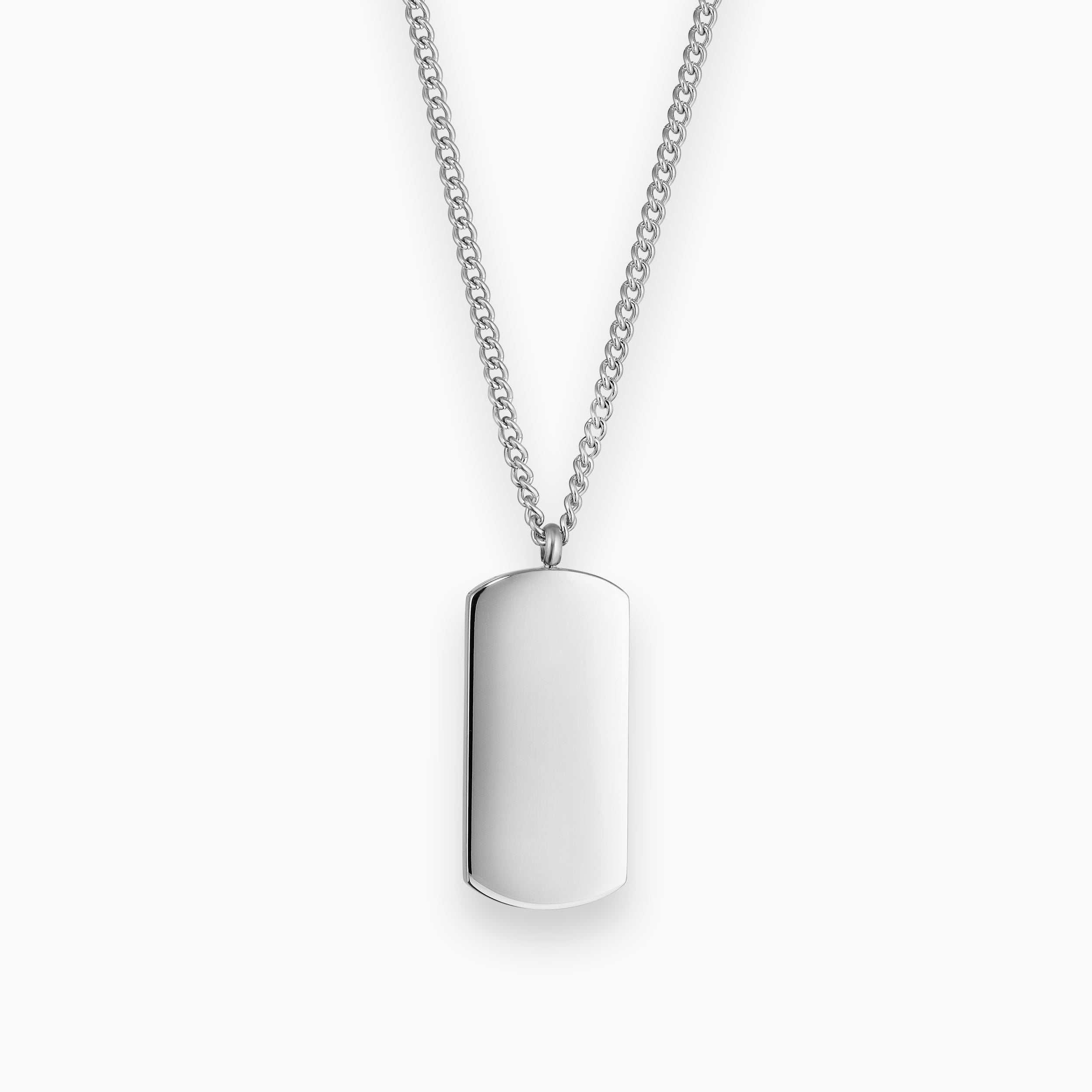 Herenketting met persoonlijke gravure in roestvrij staal. Stijlvolle en strakke ketting met een rechthoekige hanger in een glanzende afwerking.
