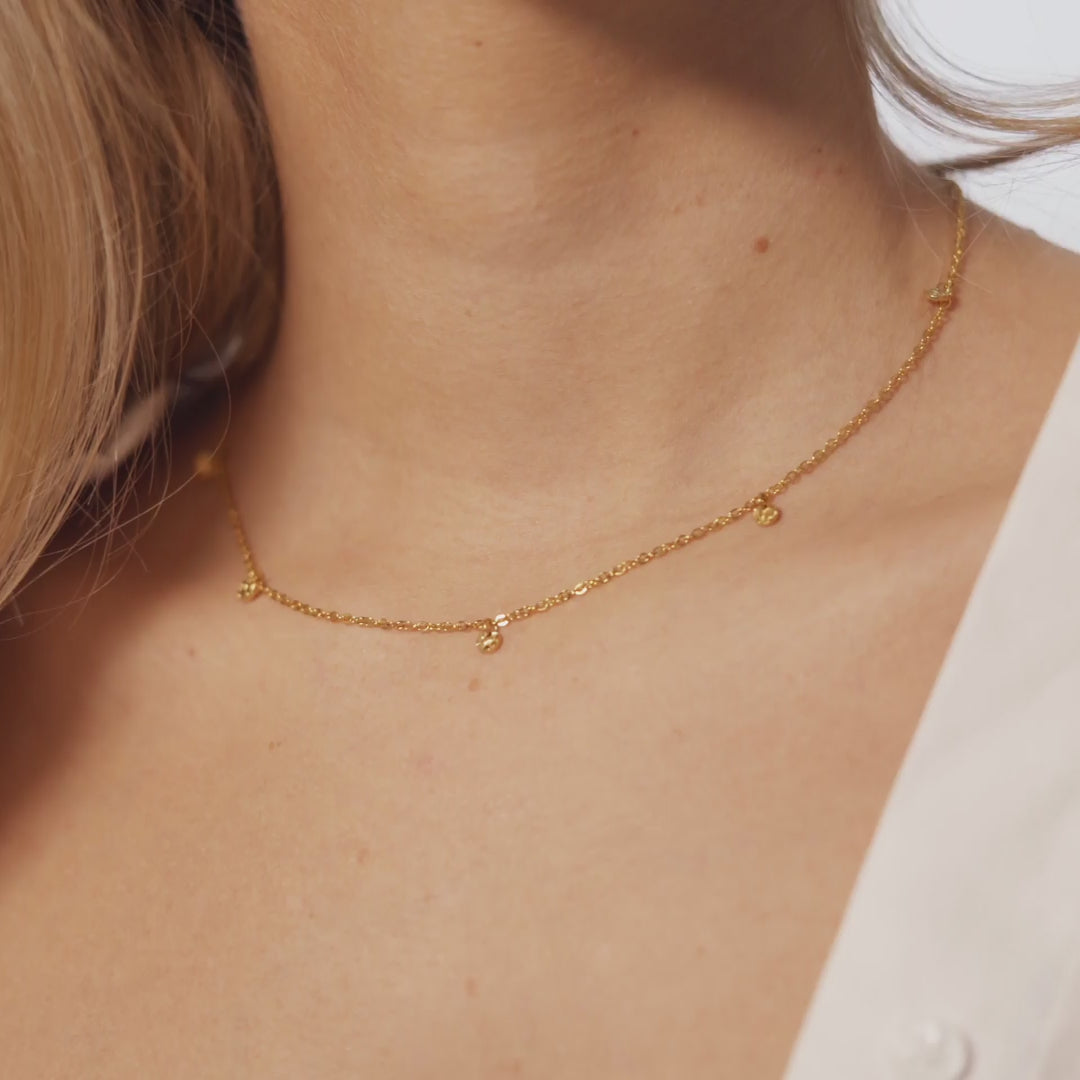 De ketting is 40+5 cm lang. De ketting heeft 8 hangende, hamerslag coins met een diameter van ongeveer 1 mm.