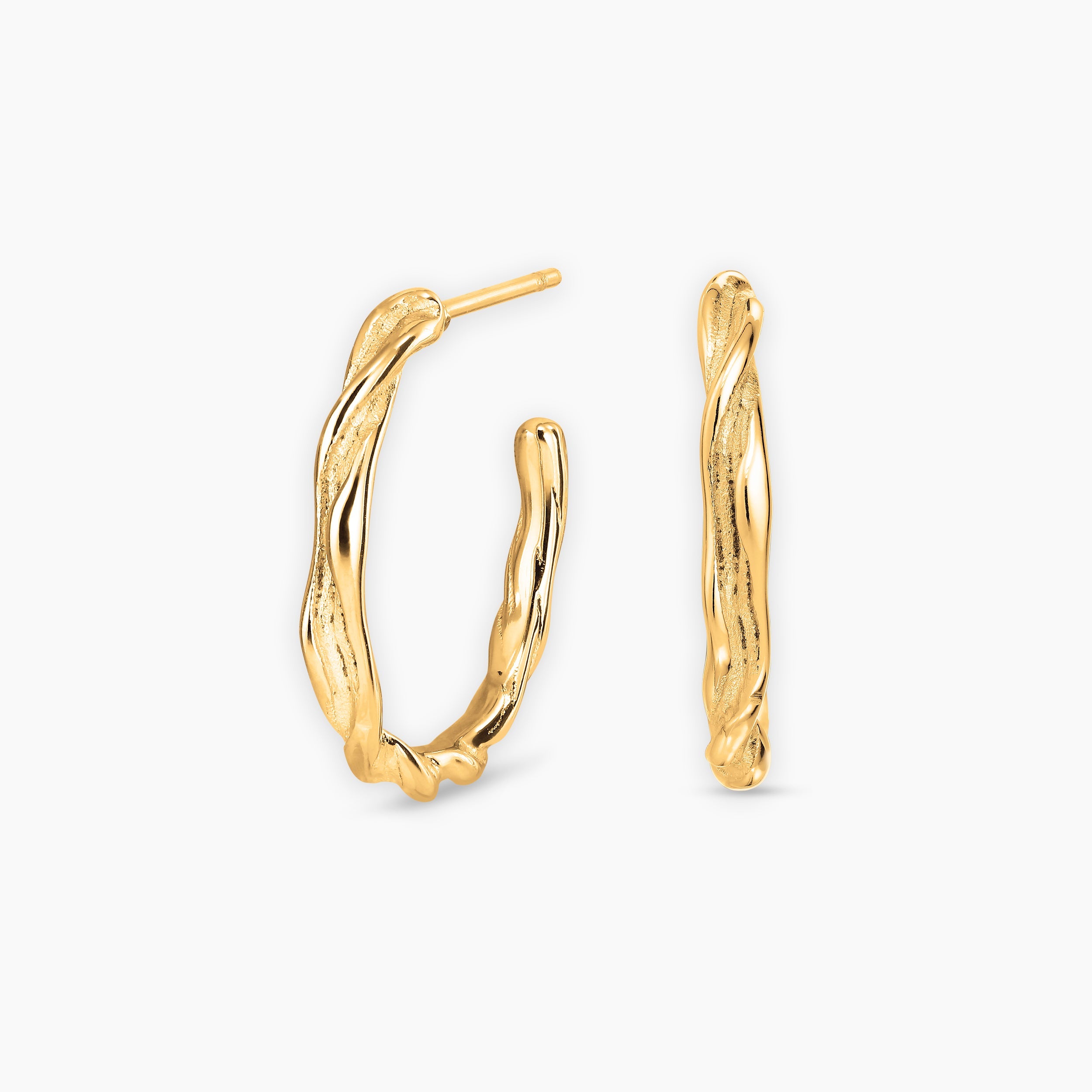 Twist Hoops oorbellen van 20 mm diameter, gemaakt van roestvrij staal. De gouden oorbellen zijn verguld met 18-karaats goud.